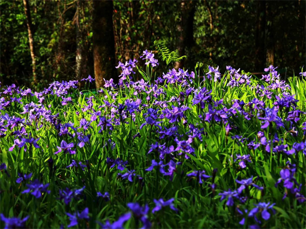 親密接觸。遠處,那些錯落有致的鳶尾花與周圍的山林相互映襯,讓靜寂的山林多了幾分嫵媚與溫馨。